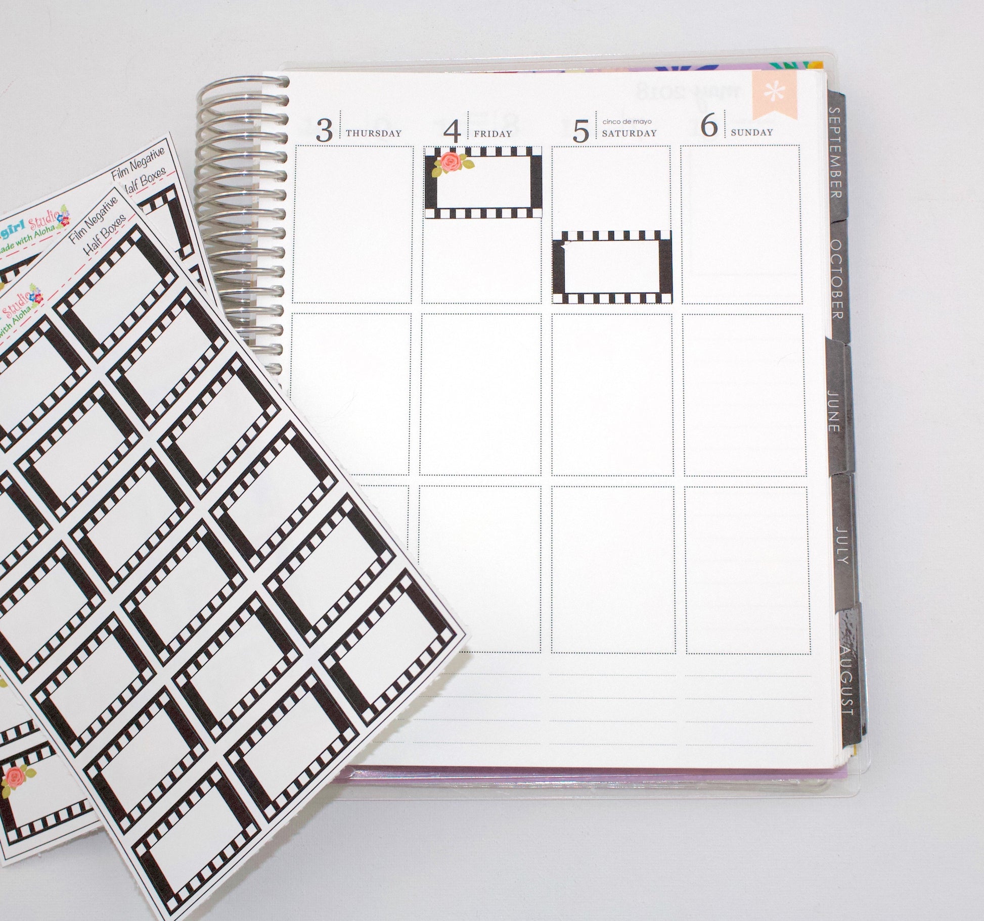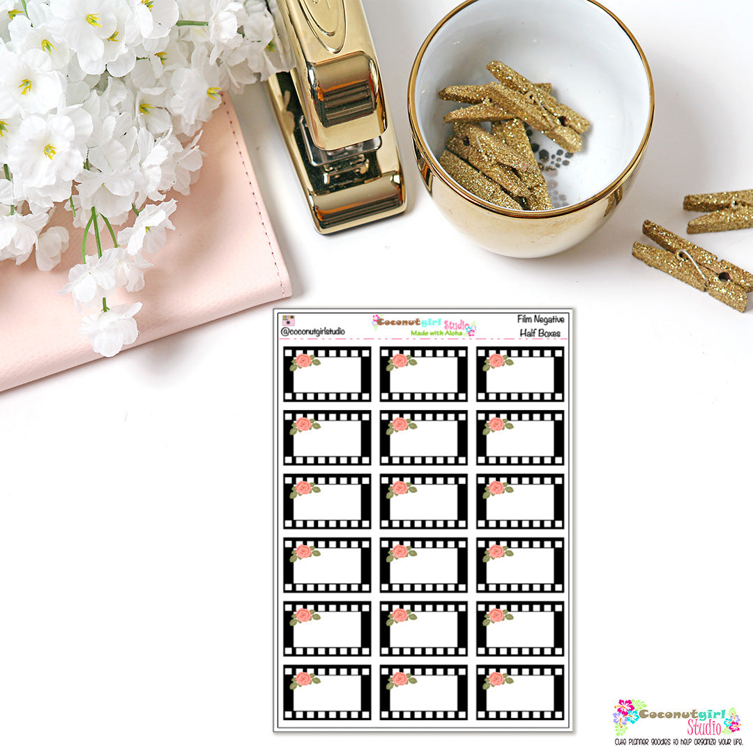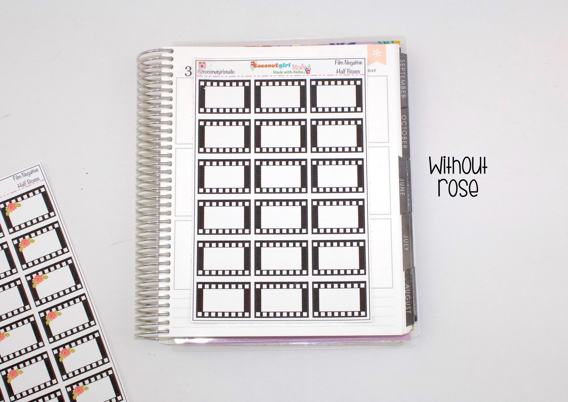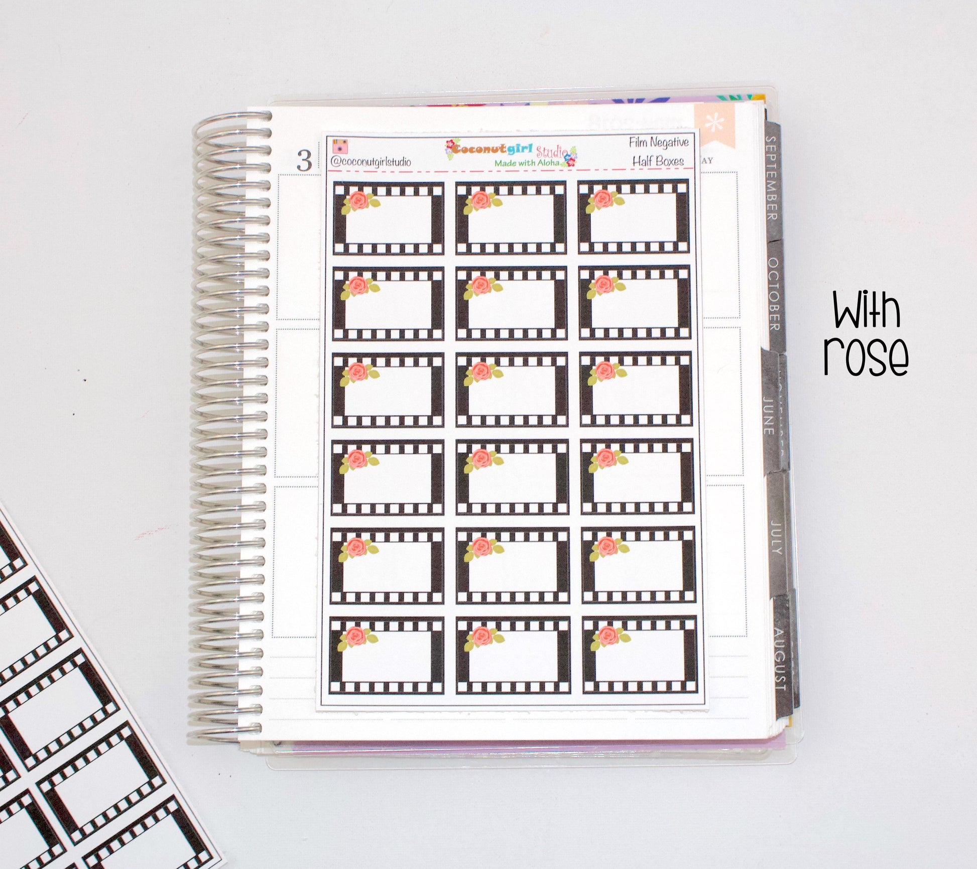 DETAILED INFOA film lover, or someone who loves cameras, these cute film negative design half boxes are great for marking special events. Great for marking filming a youtube video or picture day or reminder to post a pic on social media! A perfect way to draw attention to something important in your planner!