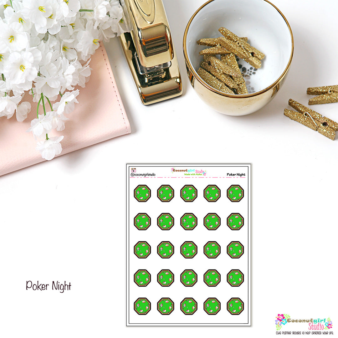 One sheet of kiss cut poker night stickers! This cute poker table is perfect for those nights you have poker night w/ family and/or friends! We also have this in a cursive version which says poker night with some cards, which you can find in our cursive section!