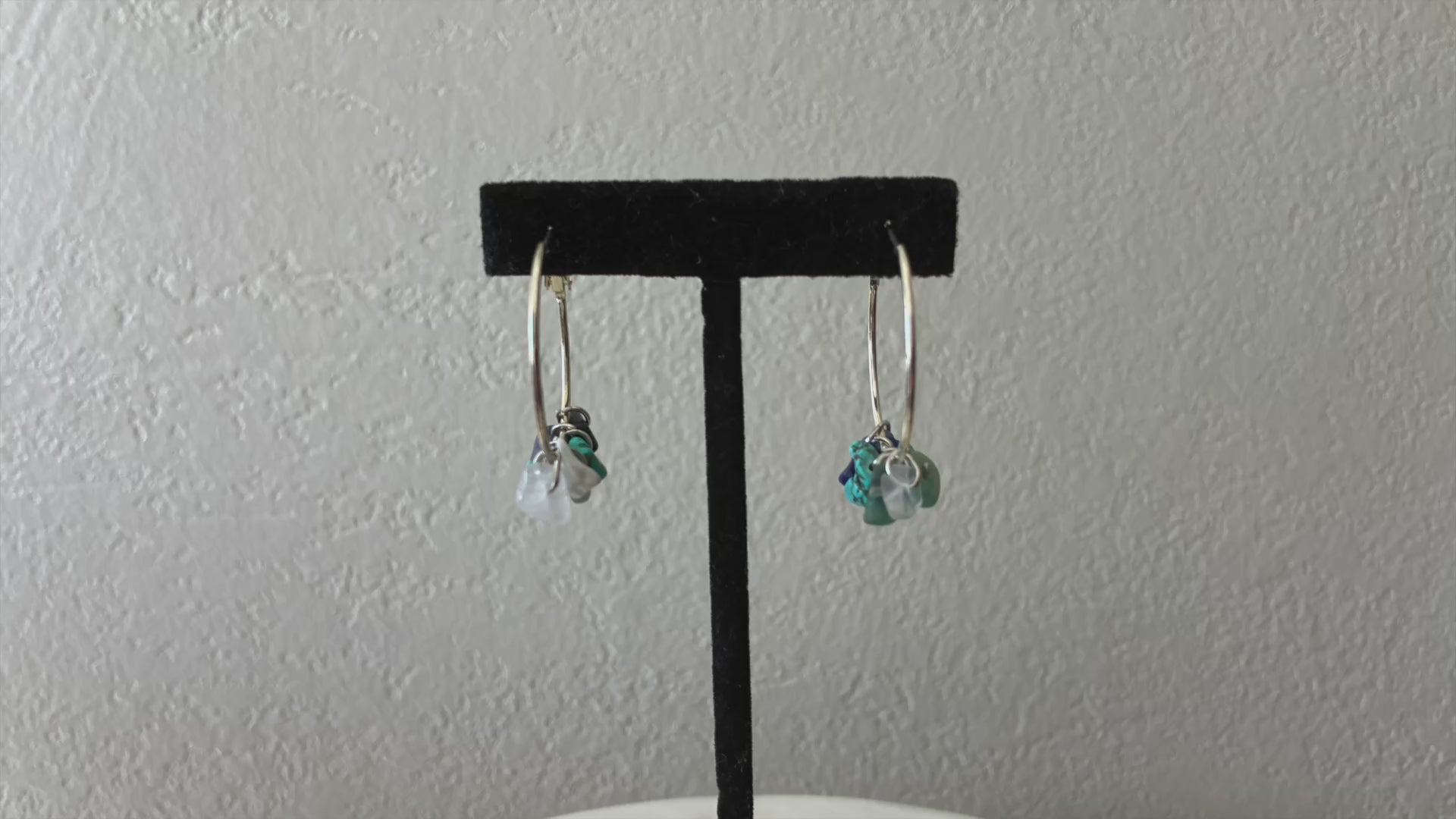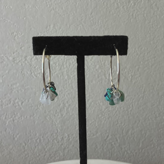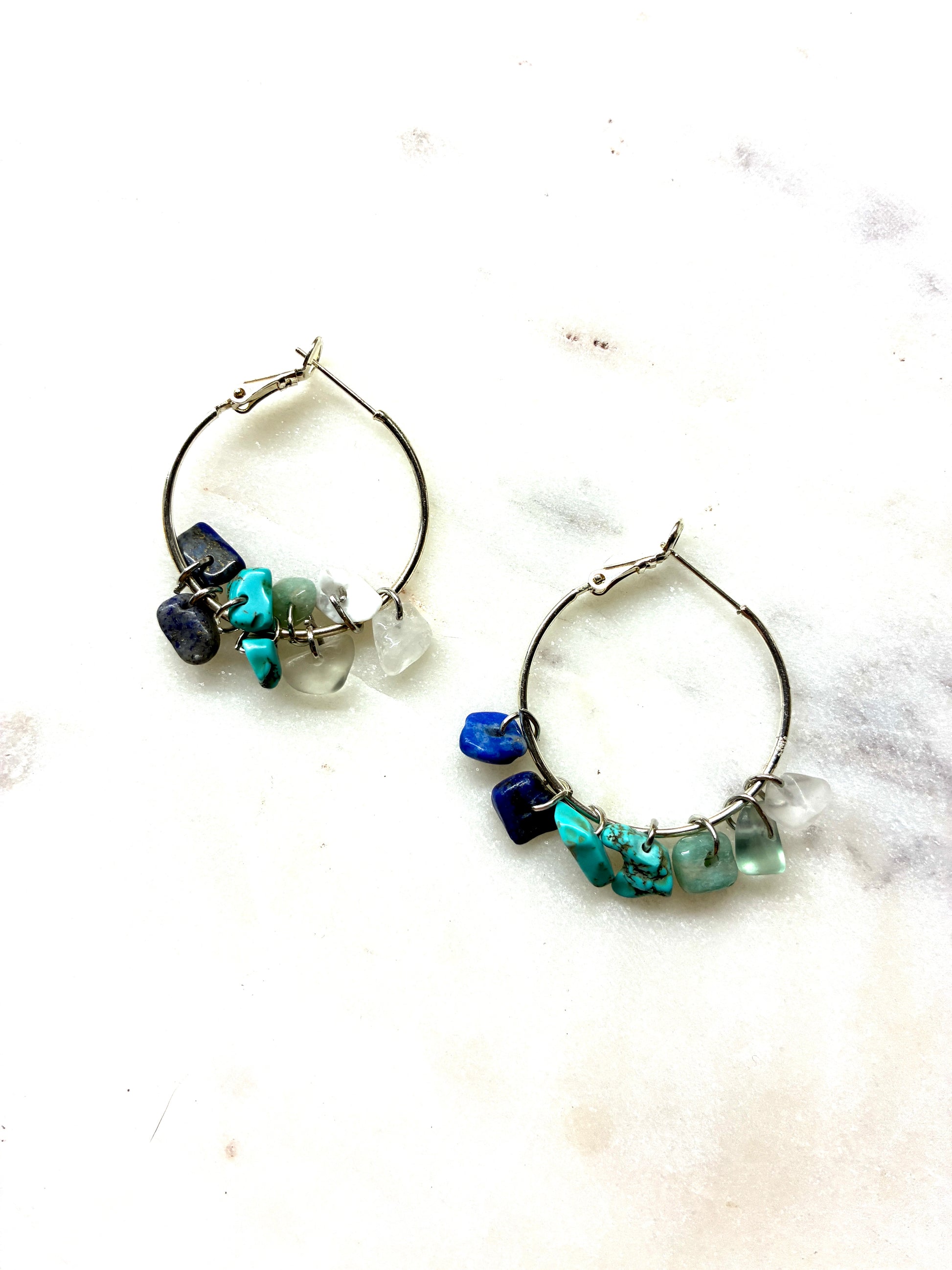 Carry a bit of the ocean with you. These fun hoop earrings feature natural stones in dreamy seafoam hues, blending the blues that echo the colors of the shore. The classic hoop design adds timeless charm. Lightweight and versatile, they’re perfect for everyday wear or as a breezy nod to summer.