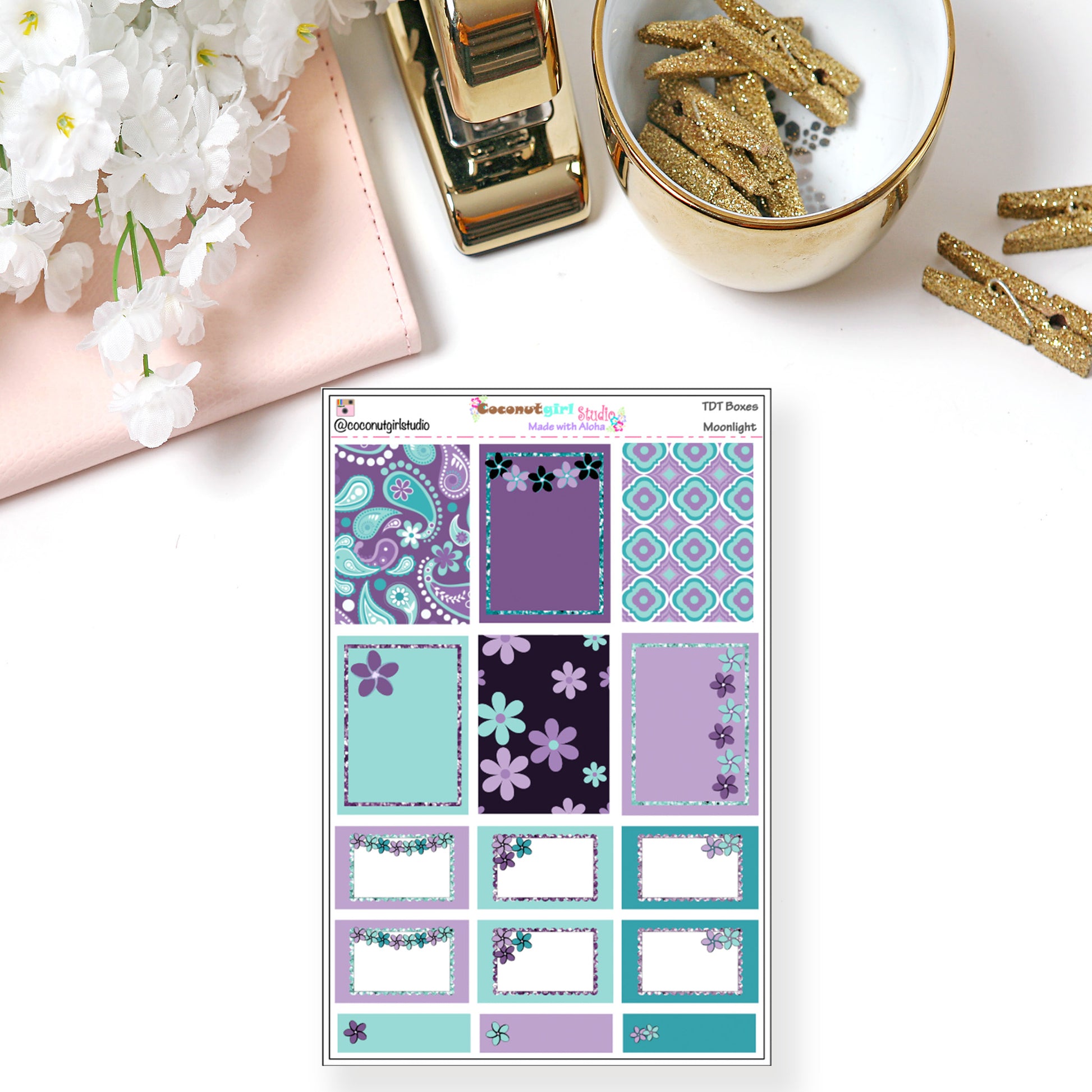 This is a sample of boxes from our Moonlight weekly kit. You get 1 full sheet of this romantic plumeria filled kit.